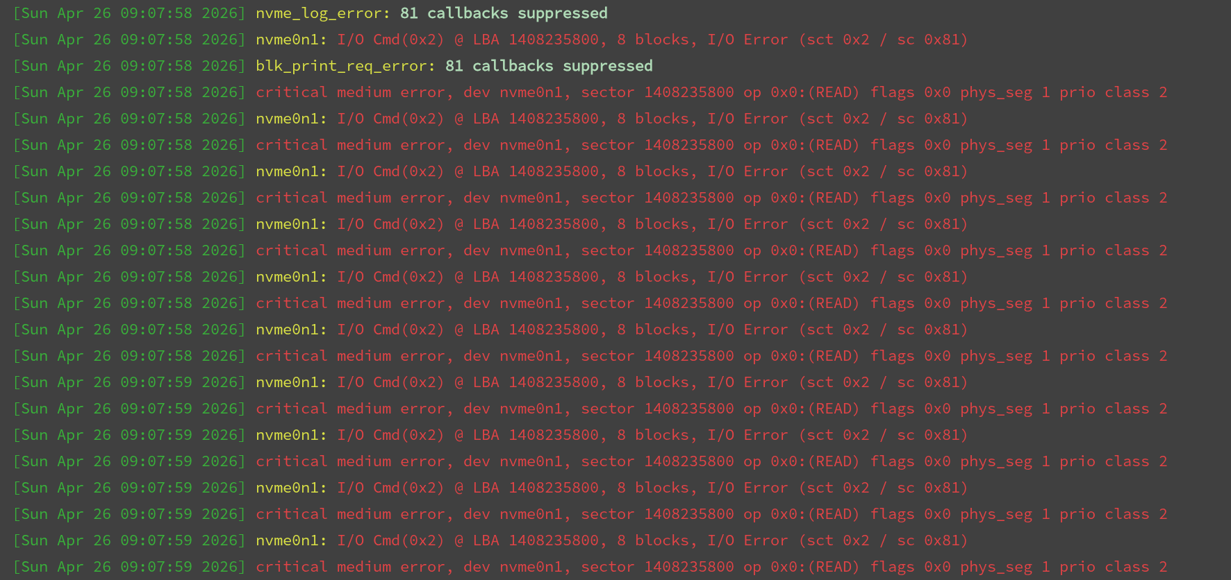 [Sun Apr 26 09:07:59 2026] nvme0n1: I/O Cmd(0x2) @ LBA 1408235800, 8 blocks, I/O Error (sct 0x2 / sc 0x81)